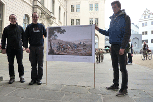 Im Frühjahr 1818 fand die erste belegte Draisinen- Fernfahrt von Dresden nach Leipzig statt. Begleitet von schwungvoller Musik von 2Hot wurde der Start dieser Fahrt 200 Jahre später nachgestellt. Ideengeber dieses Jubiläums war der ADFC Sachsen, welcher bei Presserecherchen auf diese Fahrt von 1818 gestossen war. Die Strecke von 120 km wurde lt. Pressemitteilung damals in nur 7 Stunden absolviert. Höchstwahrscheinlich war es der Mechanikus Heinrich Bertholdy, der auf eigenem Fabrikat diese Strecke fuhr. Die Gelegenheit zur Mitfahrt nahmen nun der Direktor des Verkehrsmuseum Dresden - Joachim Breuningen - sowie Mitglieder des Radfahrvereins Weinböhla, unseres Vereins samt Gästen war. |
